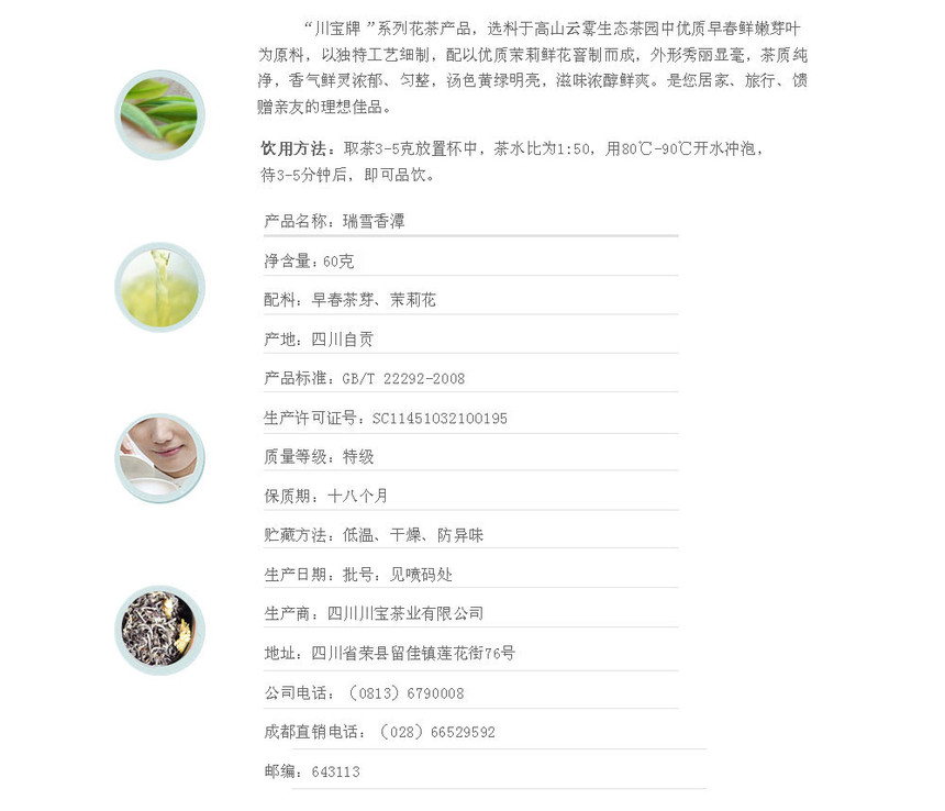 “川宝”牌系列花茶产品选料于高山云雾生态茶园中优质早春鲜嫩芽茶叶为原料,以独特工艺细制、配料、以优质茉莉鲜花窨制而成,外形秀丽显毫、匀整,汤色黄绿明亮,滋味鲜爽,是您居家、旅行、馈赠亲友的理想佳品