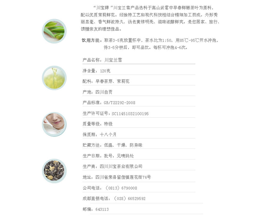“川宝”牌礼品系列产品,选料于高山云雾生态茶园中优质早春鲜嫩芽茶叶为原料,以独特工艺细制、配料、以优质茉莉鲜花窨制而成,外形秀丽显毫、匀整,汤色黄绿明亮,滋味鲜爽,是您居家、旅行、馈赠亲友的理想佳品