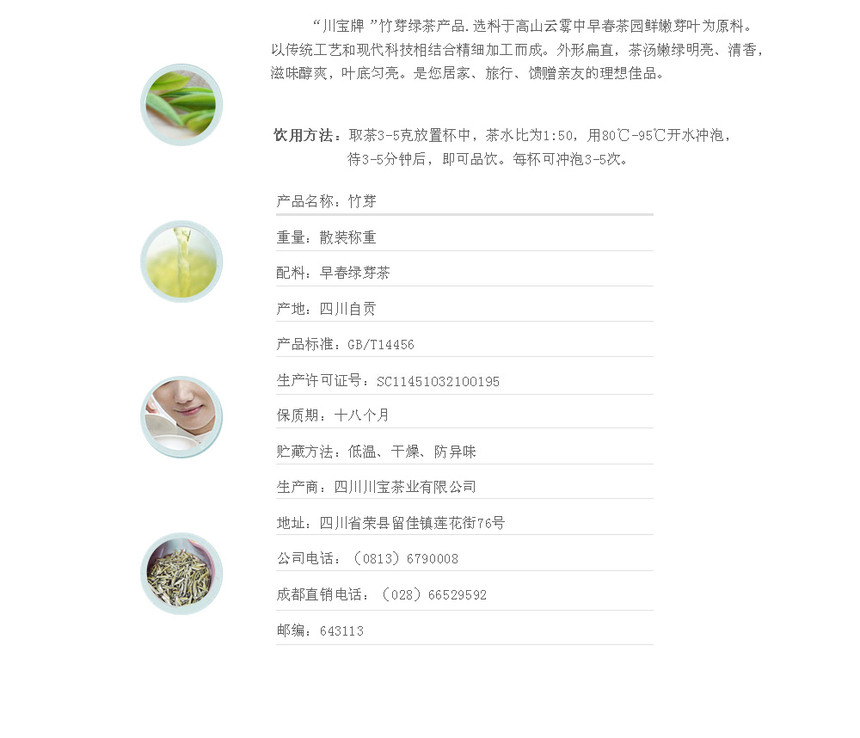 “川宝”牌雀舌高档绿茶,外形扁直、茶汤嫩绿明亮、栗香馥郁、滋味鲜嫩醇爽、茶叶均亮,是您居家、旅行、馈赠亲友的理想佳品。500g/份,需多买请选择数量